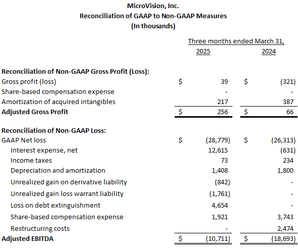To supplement MicroVision's condensed financial statements presented in accordance with GAAP, the Company presents investors with the non-GAAP financial measures "adjusted EBITDA" and "adjusted Gross Profit." Adjusted EBITDA consists of GAAP net income (loss) excluding the impact of the following: interest income and interest expense; income tax expense; depreciation and amortization; non-cash gains and losses; share-based compensation; and restructuring costs. Adjusted Gross Profit is calculated as GAAP gross profit before share-based compensation expense and the amortization of acquired intangibles included in cost of revenue.